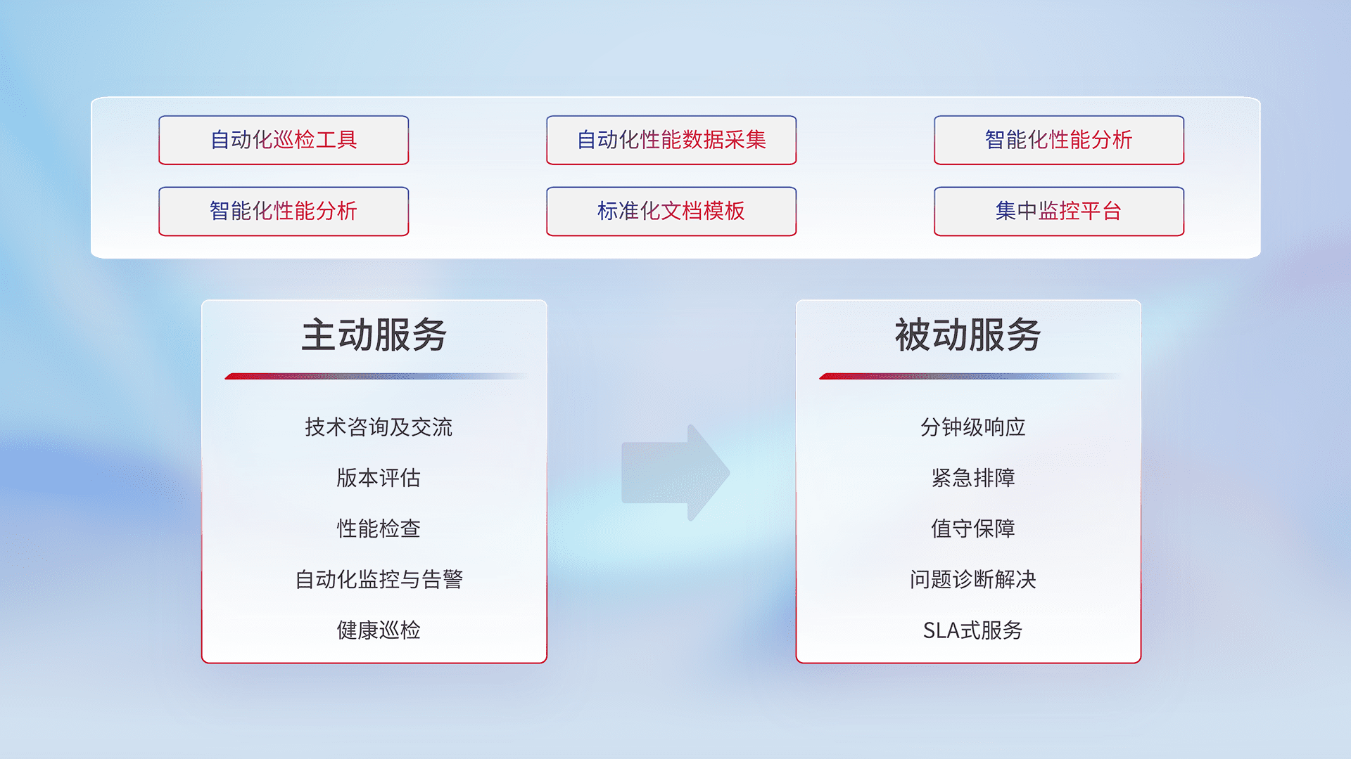 智能化工具和标准化文档,,保障服务质量,,提供主动服务(包含技术咨询、、、版本评估、、性能检查、、、自动化监控与告警、、、健康巡检)和被动服务包含(分钟级响应、、、、紧急排障、、值守保障、、、、问题诊断解决、、、SLA服务)。。
